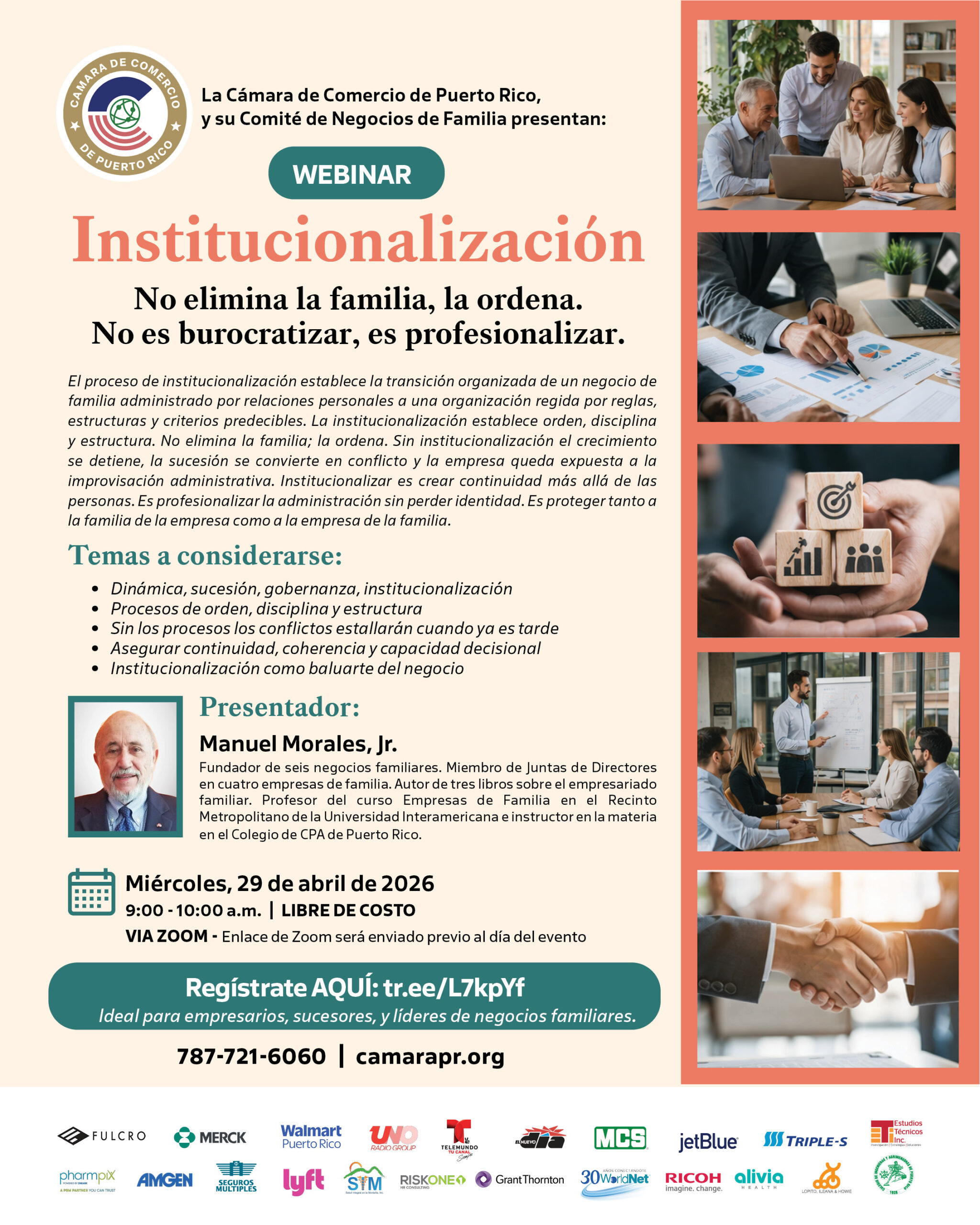 Founder of six family businesses. Board member of four family-owned companies. Author of three books on family entrepreneurship. Professor of the Family Business course at the Metropolitan Campus of the Inter American University and instructor on the subject at the Puerto Rico Society of CPAs.